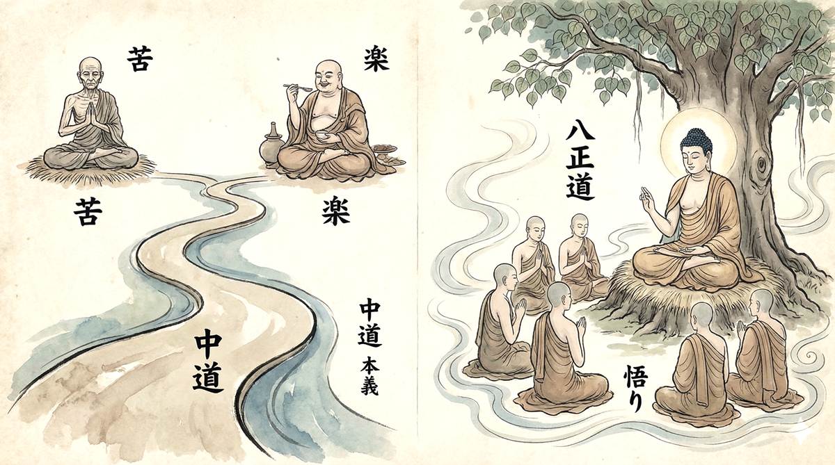 中道とは、極端を避ける「ちょうどよい生き方」という日常的な意味ではなく、悟りに至るために二つの対立的立場を超える実践的な道を指します。お釈迦様は自身の経験を通してこの道を見出し、最初の説法でそれを示しました。